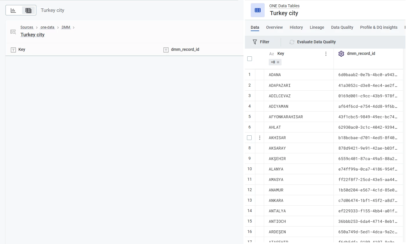 For example, consider the Turkey City table shown in the image. The left side of the image shows the visualization screen, while the right side shows the corresponding ONE data table containing the records.