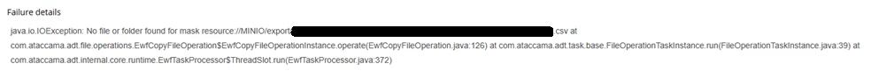 I am currently trying to retrieve files from the Minio storage. In Desktop I have a workflow which gets a file from Minio using the above method, which works as expected. I've exported the runtimeConfig from desktop and put it on the orchestration server. When I trigger the workflow on the server, the workflow can't find the file and gives the following error: