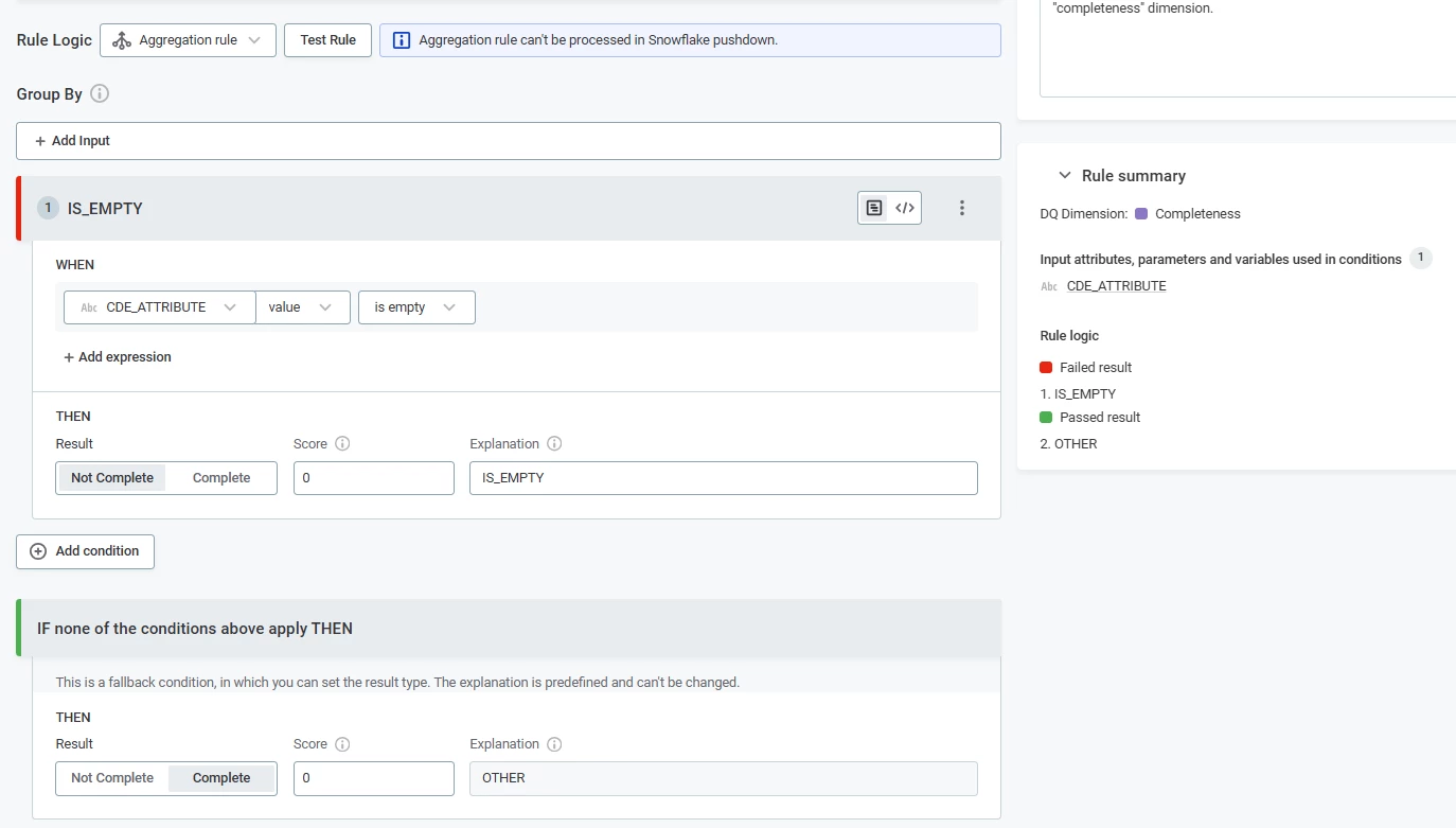 I am trying to create a data quality rule for completeness, but it fails every time I click on evaluate.